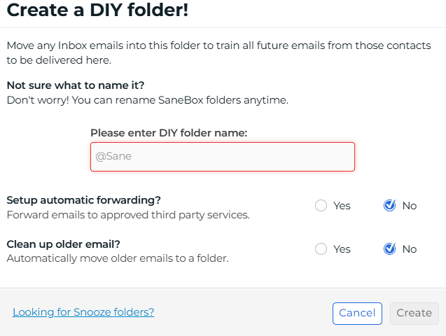 - Forwarded emails will appear in your Sent folder and have “[SaneBox]” in the subject line.