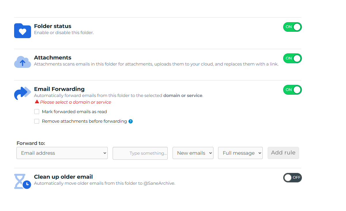 - Sorts and Forwards: Like a custom training folder, SaneFwd automatically routes emails to a designated folder.