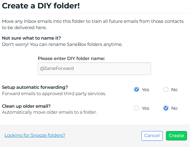 - Name your folder and check Yes for “Setup automatic forwarding”