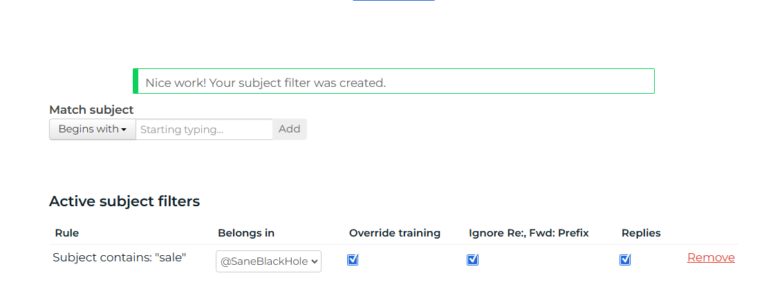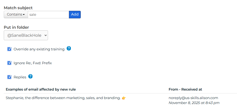 - Set up subject or domain filters to automatically route matching emails to SaneBlackHole.